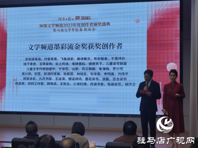 1月6日上午,由河南日报社、河南省文联、河南省作家协会指导,顶端新闻、河南省文学院、河南省报告文学学会、河南省散文学会主办,顶端新闻文学频道与时代报告杂志社承办的“顶端文学频道2023年度创作者颁奖盛典暨河南文学界新春联谊会”在河南省文学院隆重举行。其中新蔡县作家协会会员、顿岗乡公务员龚兴炯受邀赴郑州参加并荣获河南日报顶端新闻“墨彩流金奖”,也是驻马店市6名获奖人员中的年轻作家。