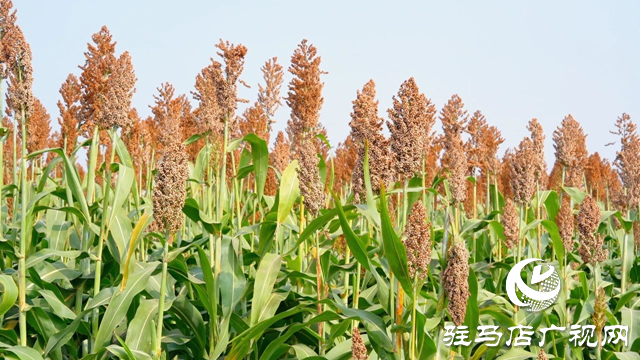 在洪汝河湿地保护区谢湾村1300亩衡糯12号优质高粱种植基地,放眼望去,红彤彤的高粱颗颗饱满晶莹,伴随着隆隆轰鸣声,6台大型高粱收割机将一株株高粱连秆带穗卷入其中,收割、摘穗、脱粒一气呵成。