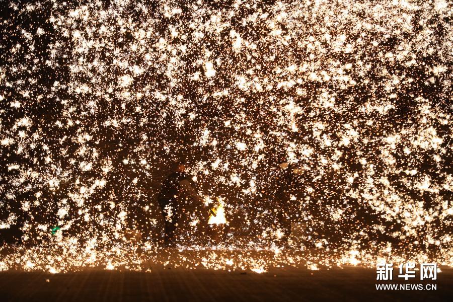 元宵佳节临近,山东省临沂市郯城县郯国古城推出“打铁花”节目表演,红红火火迎元宵。(新华社发 张春雷摄)