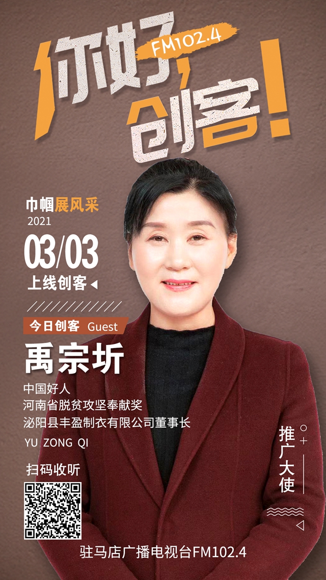 3月3日,由驻马店广播电视台FM102.4经济广播创办的创业就业类现场秀节目《你好,创客!》将邀请泌阳县丰盈制衣有限公司禹宗圻走进直播间,听众朋友可以在当天上午9点—10点锁定FM102.4收听节目直播,并通过公众号“畅行天中”留言与创客直接互动交流。驻马店广播电视台将由新闻综合频道、公共频道、科教频道 、驻马店广视网 、驻马店融媒组成强大阵容全媒体播出节目实况。