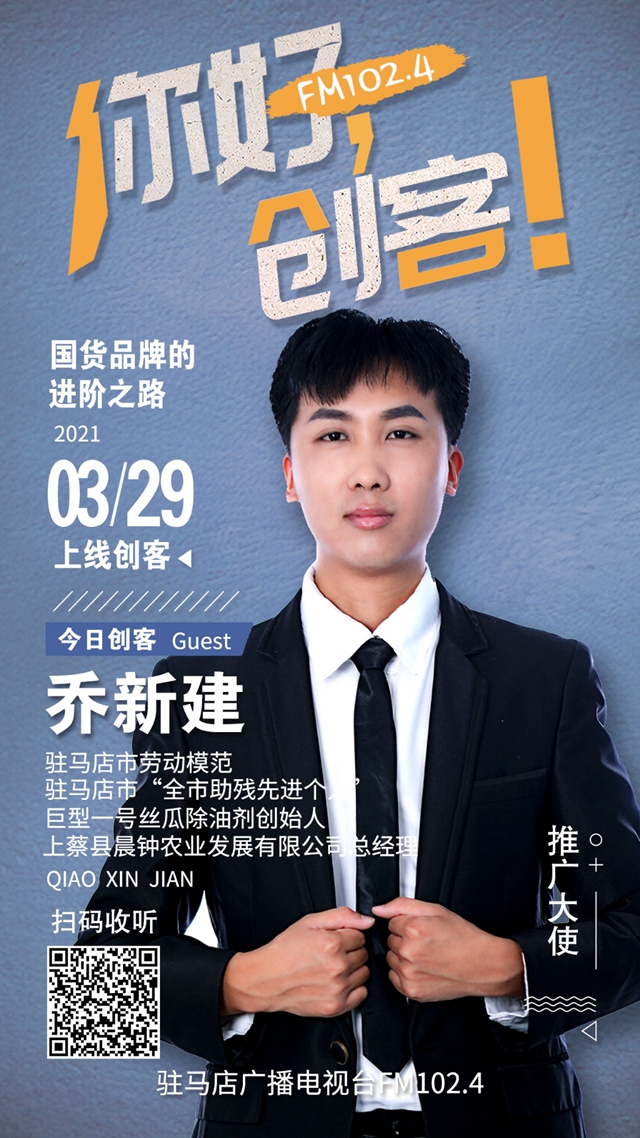 3月 29日,开启“导师创客面对面”特别节目,为您邀请河南大众创业导师苏东江对巨型一号除油剂创始人乔新建进行现场创业指导,听众朋友可以在当天上午9点—10点锁定FM102.4收听节目直播,并通过公众号“畅行天中”留言与创客直接互动交流。驻马店广播电视台将由新闻综合频道、公共频道、科教频道 、驻马店广视网 、驻马店融媒组成强大阵容全媒体播出节目实况。敬请关注!