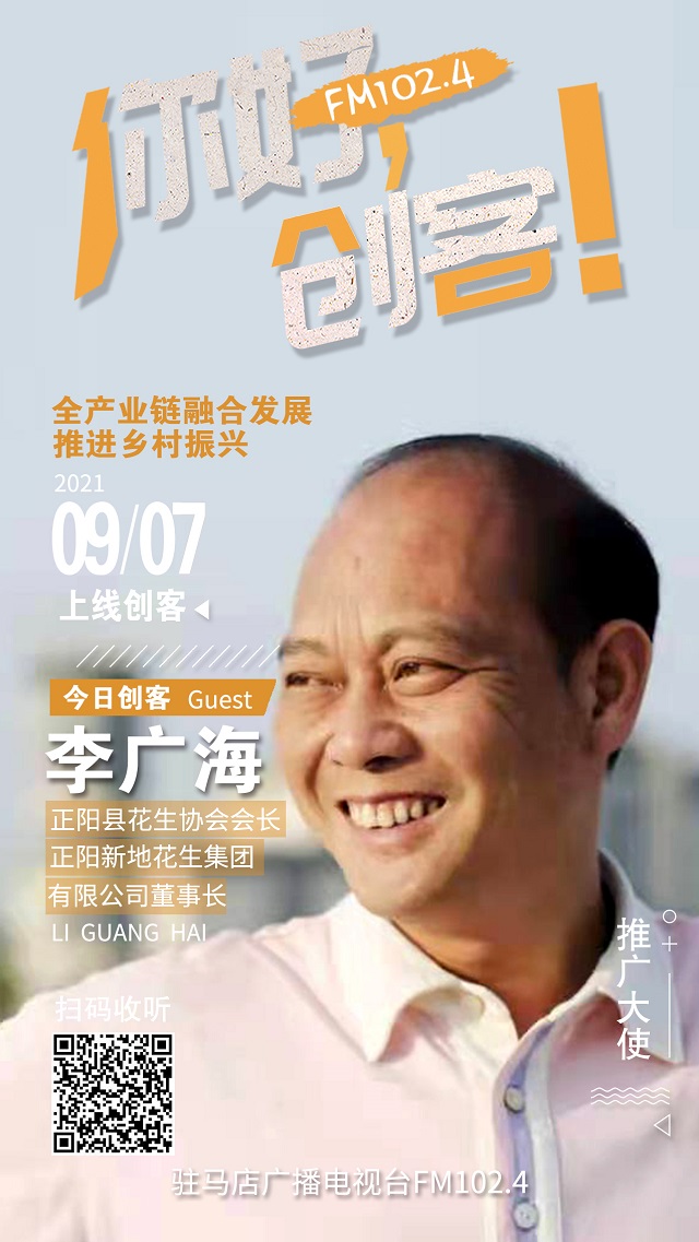 9月7日星期二,由驻马店广播电视台FM102.4经济广播创办的创业就业类现场秀节目《你好,创客!》将邀请正阳县新地花生集团有限公司董事长李广海走进直播间,听众朋友可以在当天上午9点—10点锁定FM102.4收听节目直播,并通过公众号“畅行天中”留言与创客直接互动交流。驻马店广播电视台将由新闻综合频道、公共频道、科教频道、驻马店广视网、驻马店融媒组成强大阵容全媒体播出节目实况。