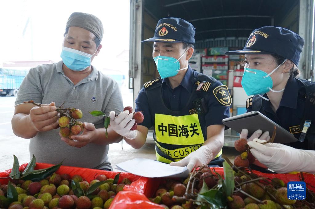 5月24日,拱北海关所属闸口海关关员对供澳高州荔枝进行查验。新华社发(朱伟俊 摄)