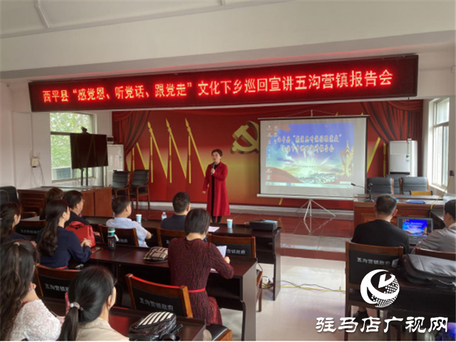 近日,西平县五沟营镇政府召开了一次别开生面的“感党恩、听党话、跟党走”文化下乡巡回宣讲报告会,来自全镇的镇直机关干部职工、驻村第一书记、支部书记还有部分群众代表100多人来到报告会现场,认真聆听县“感党恩、听党话、跟党走”文化下乡巡回宣讲团八名同志的倾情报告。