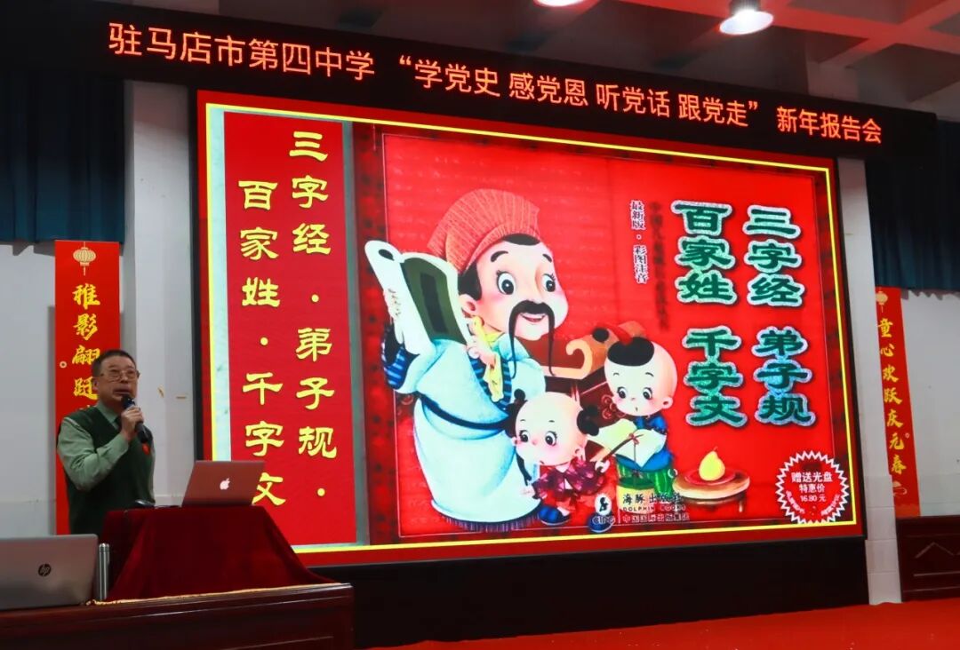 2025年12月31日,在这辞旧迎新的特殊时刻,驻马店市第四中学报告厅内气氛庄严而热烈。一场面向八年级学生的“学党史、感党恩、听党话、跟党走”新年主题报告会,在雄壮的国歌声中拉开帷幕。
