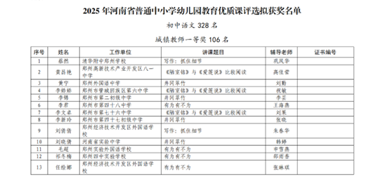 捷报传喜讯,教坛绽芳华!近日,2025年河南省普通中小学幼儿园教育优质课评选活动圆满收官。驻马店市第十八初级中学袁超老师凭借扎实的语文素养、创新的课堂设计,荣获初中语文城镇教师一等奖,为驻马店市第十八初级中学教育教学成果再添浓墨重彩的一笔!