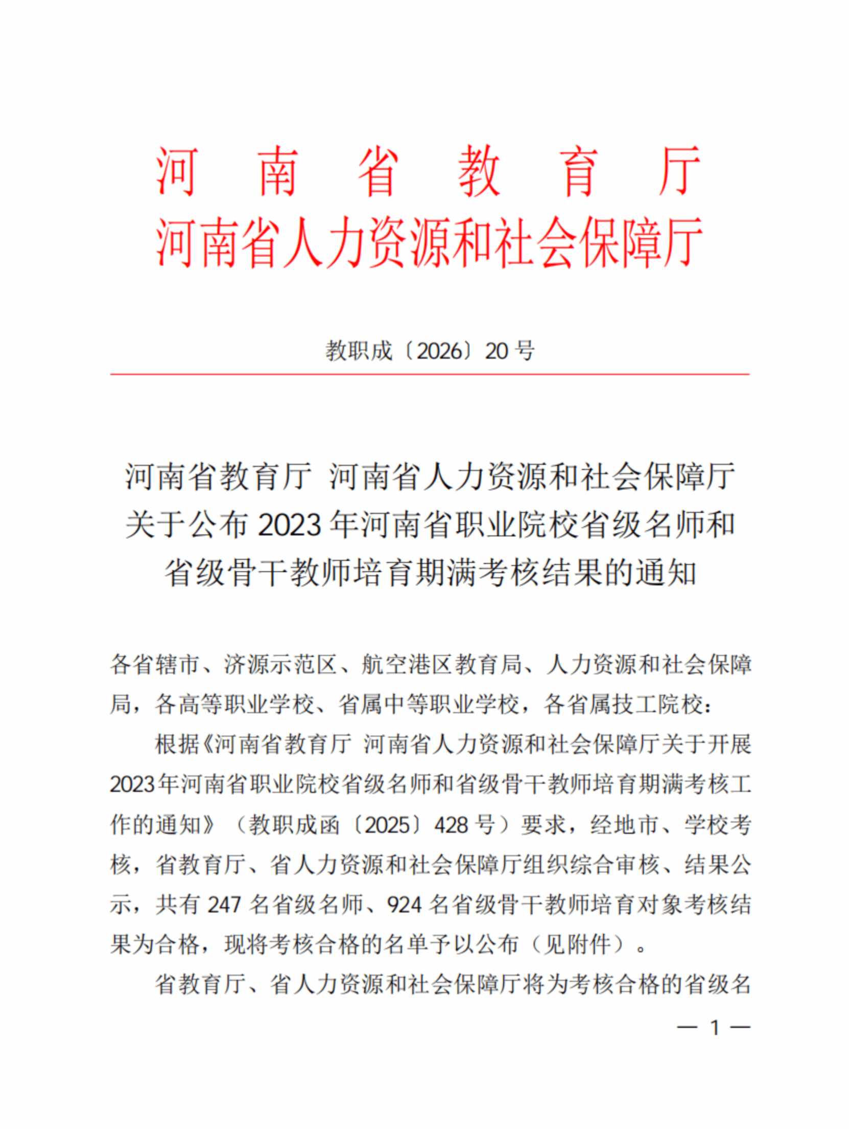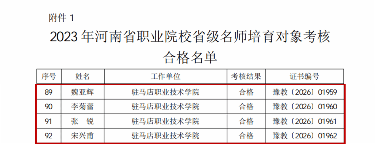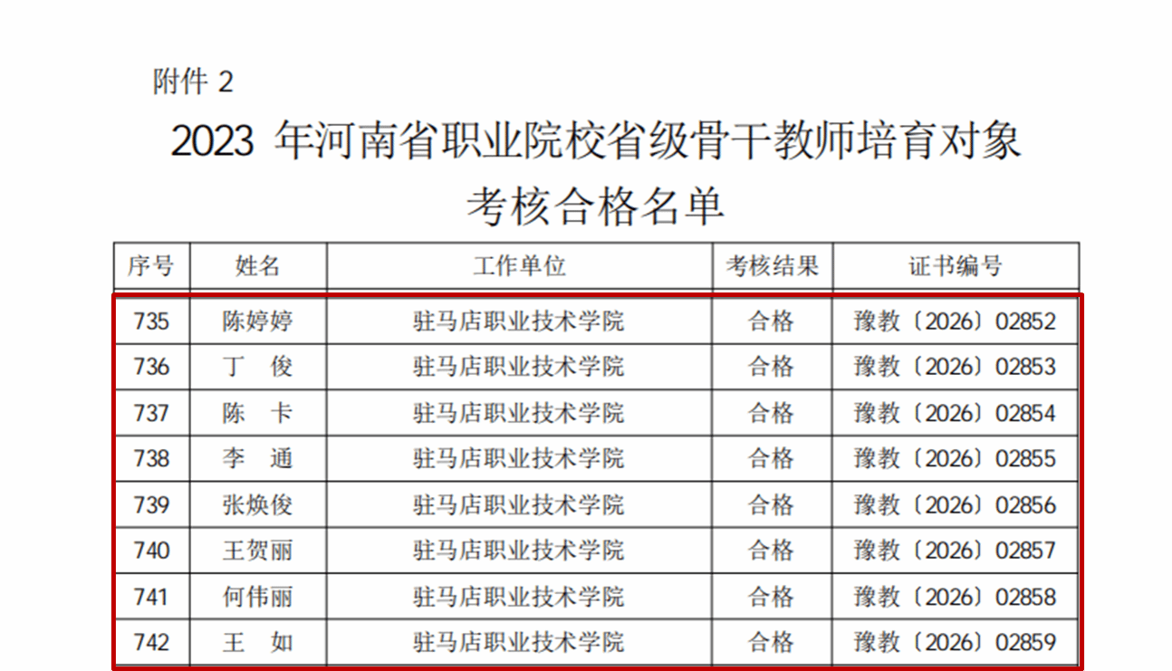 近日,河南省教育厅与河南省人力资源和社会保障厅联合发布《关于公布2023年河南省职业院校省级名师和省级骨干教师培育期满考核结果的通知》(教职成〔2026〕20号),驻马店职业技术学院多名教师考核合格,分别荣获省级名师和省级骨干教师称号。