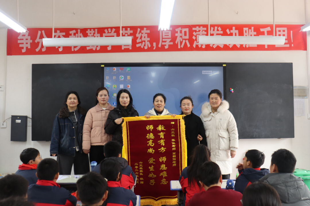 另一面锦旗则献给了班级的两位老师——班主任张佳老师和副班主任高朝阳老师,锦旗上写着【教育有方 师恩难忘 师德高尚 爱生如子】。家长们动情地说:“两位老师不仅是孩子学业上的引路人,更是生活中的‘妈妈’。从清晨的早读到傍晚的放学,从课堂上的循循善诱到课后的促膝谈心,老师们的耐心、细心和责任心,我们家长都看在眼里,感动在心里。特别是在孩子面临‘小升初’的关键时期,老师们的鼓励和陪伴,给了孩子极大的信心。”