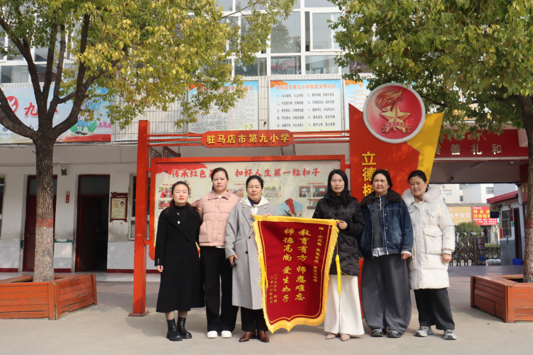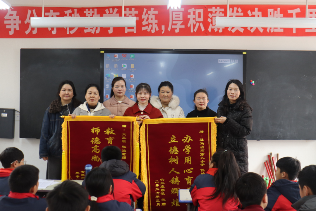 春晖遍泽,桃李芬芳。近日,驻马店市第九小学发生暖心一幕:六(3)班学生家长代表们满怀感激之情,将绣有烫金大字的两面锦旗分别送到了学校校长和班级两位老师的手中,以此表达对学校育人理念的认可,以及对老师们辛勤付出的诚挚谢意。