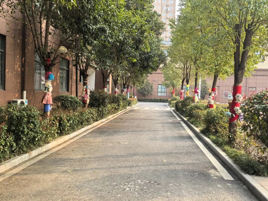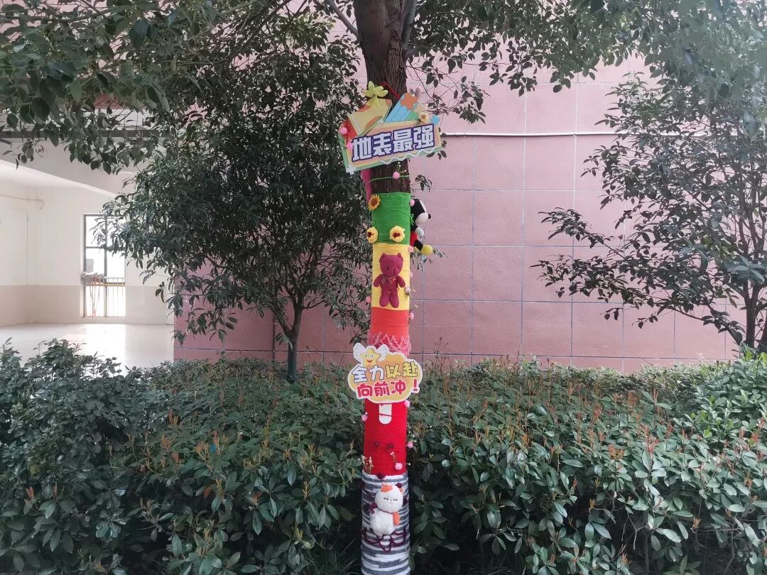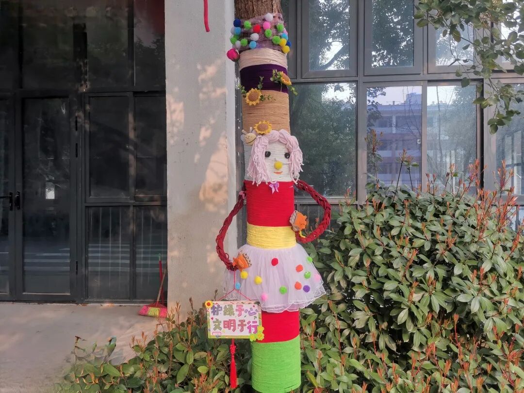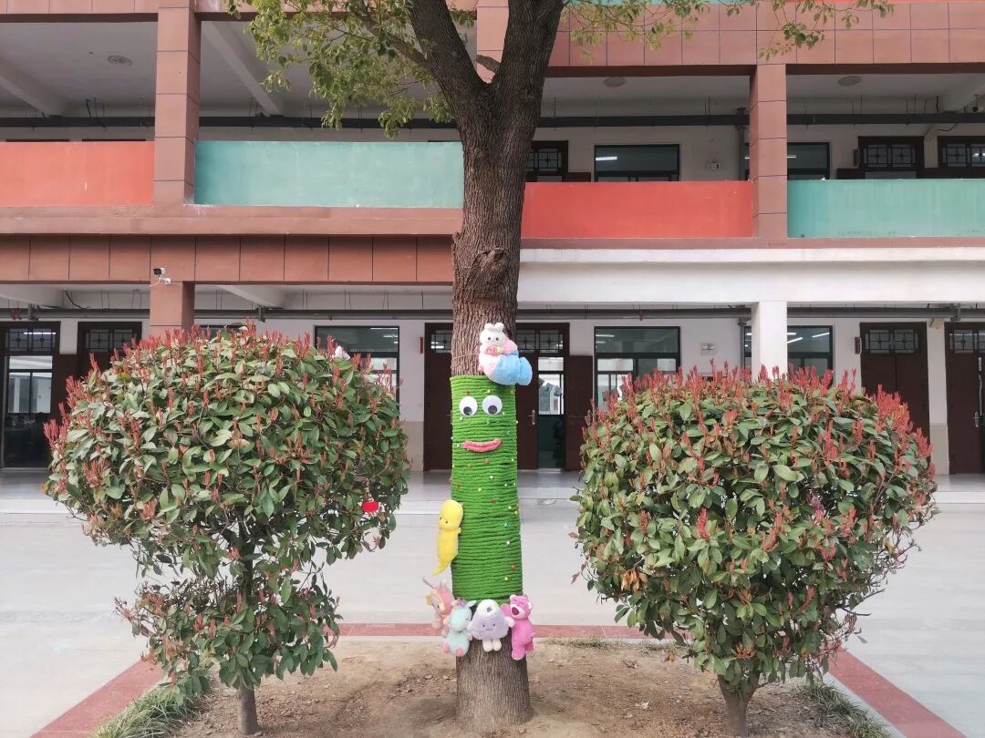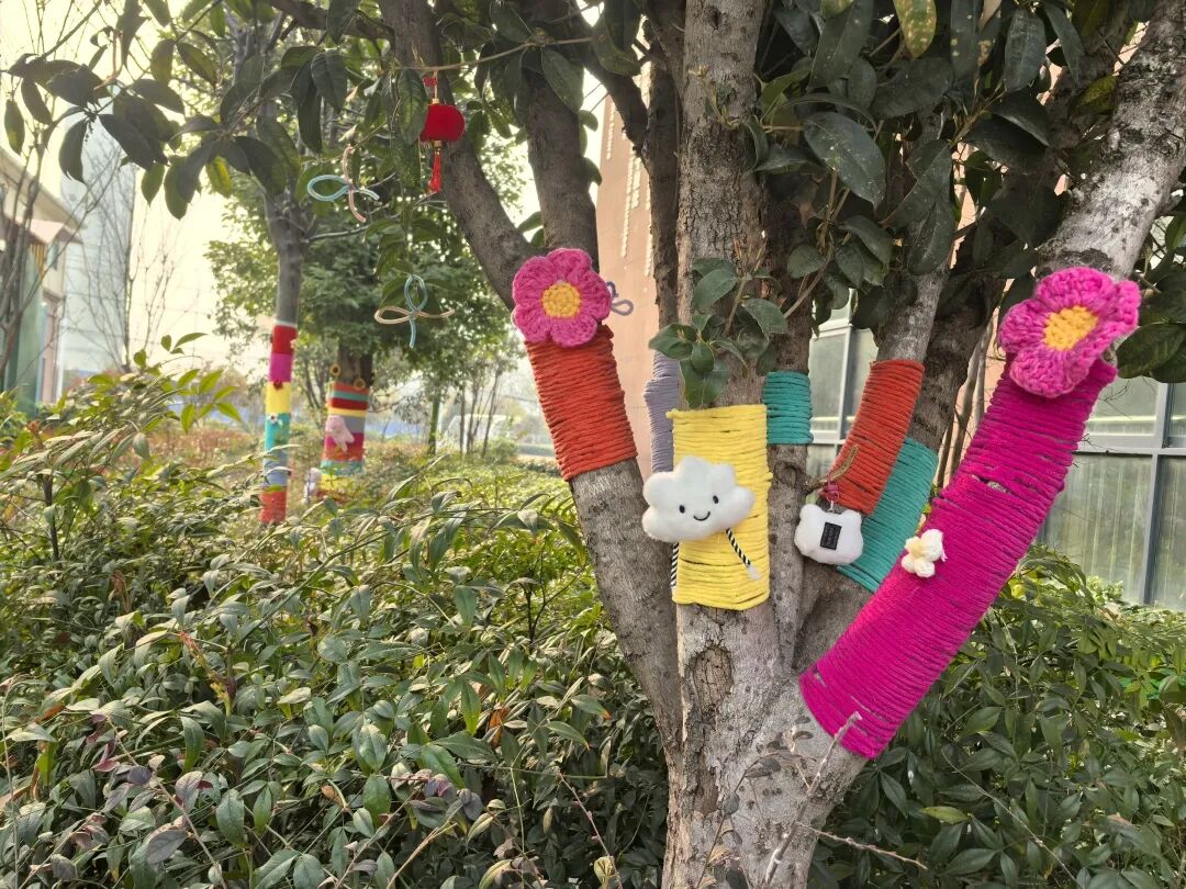 南校区则以“我为小树穿新衣”为主题,将劳动实践指向创意表达与协作互助。低年级的同学们在家长的带领下,收集毛线、布料等环保材料,为校园里的小树精心设计“春装”。缠绕、编织、粘贴、绘画……小树在同学们的装扮下变得色彩斑斓、充满童趣。