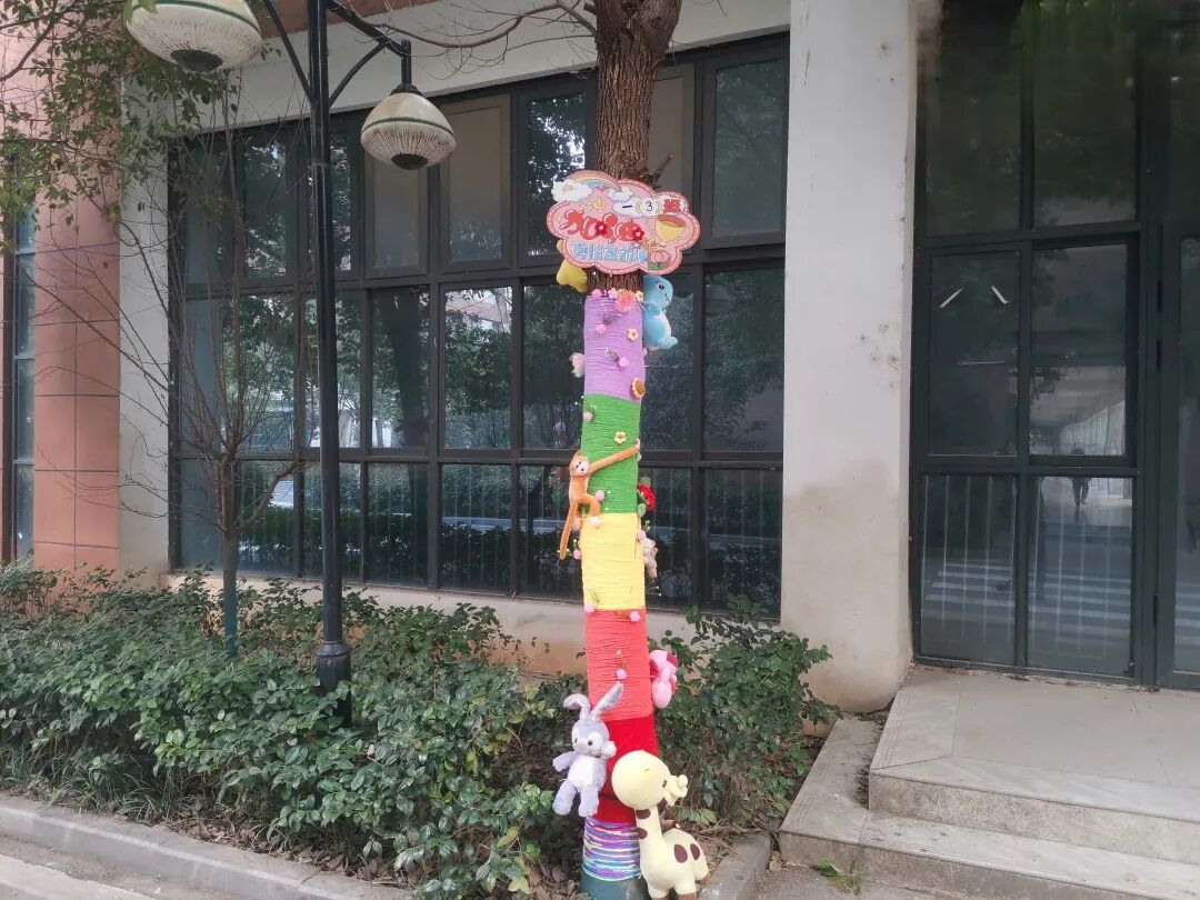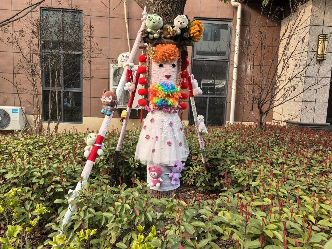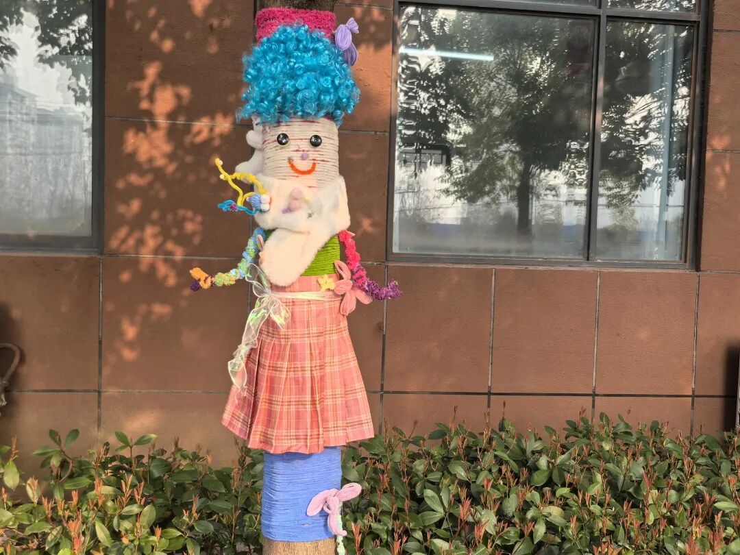 同学们围着自己亲手装扮的小树欢呼雀跃,在劳动中感受创造的快乐,在与自然的互动中学会关爱与呵护。