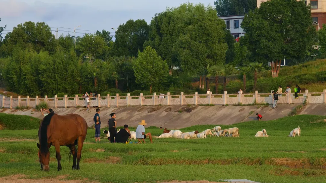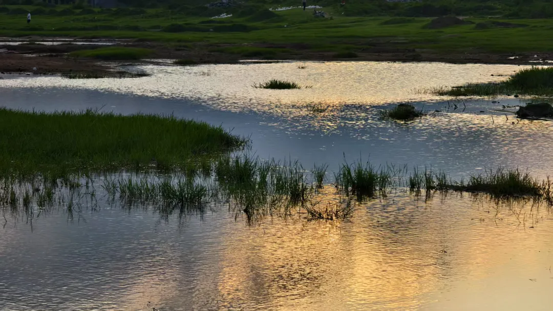 夕阳西下时,两岸青翠,云层蓝金色交织,金光倒映河面。暮色四合,云霞在天际舒展,波光粼粼。夜幕降临,湿地公园褪去白日喧嚣。皎洁月光为草地镀上银边,牛羊静立似剪影,鸭鹅依偎在岸边休憩。晚饭后的市民结伴散步,月光倒映河面,与城市灯火交相辉映,偶有夜鸟掠过水面,带起点点星光。整个湿地沉浸在温柔月色里,宛如藏着无数梦幻故事的静谧港湾。归巢的鸟儿掠过天际,留下清脆的鸣叫,市民们沉醉在这如诗如画的美景中,静静享受着宁静与美好。