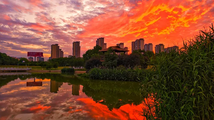 近日,河南省驻马店市遂平县城南新区,黄昏时分,彩霞满天,将天际映照得瑰丽多彩。彩云倒映在平静的水面上,如绚丽的锦缎,为炎热夏日增添了璀璨的色彩,美不胜收。张亚飞 摄