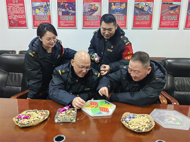 棋牌对弈,智趣交融:在跳棋与军棋桌前,职工们围坐对弈、切磋棋艺。大家凝神静气、巧思布局,在方寸棋盘间运筹帷幄,在你来我往中交流心得。有的职工在军棋“楚河汉界”间排兵布阵,攻防有度;有的在跳棋棋盘上巧妙搭桥,步步为营。大家一边品尝着花生瓜子、糖果等传统年食,一边交流互动,既锻炼了思维,又拉近了彼此距离,在轻松的氛围中增进了同事间的默契与情谊。